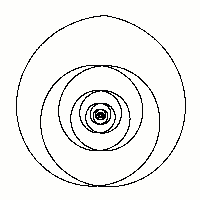 Diese Spirale erreicht bei jeder Umrundung (nach innen) genau die Hälfte des vorigen Radius. Sie hat auch nur wenig mehr Länge als den neunfachen Startradius, ist dann fast in der Mitte angelangt (Rmax*0.618/100).