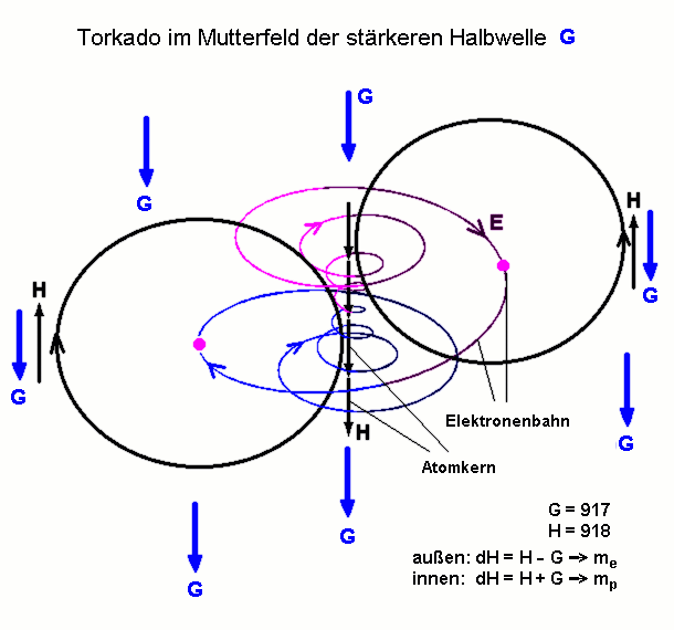 positive Ladung, die in Flussrichtung zeigt. Wird ein Wasserstoffatom "richtig" im Mutterfeld ausgerichtet, dann befindet sich außen die Elektronenhülle, deren H-Held außen das Mutterfeld kompensiert (H-G in Abb. 2.5). Steht es "auf dem Kopf" (bezüglich Mutterfeld), zeigt das begleitende H-Feld außen nach unten, verdoppelt es dabei und wir detektieren es als Proton (Ion). Wir müssen ihm ständig Energie liefern (E-Feld antreiben), um es in diesem Zustand zu halten. Ein Proton ist chemisch sehr aggressiv und versucht von selbst, in einen günstigeren Zustand zu kommen.