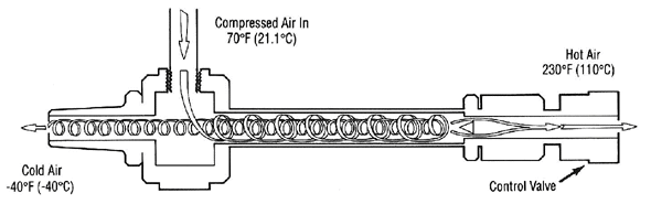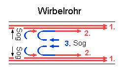 Wirbelrohre und MäanderFlüssigkeit oder komprimierte Luft wird unter Druck schräg in ein Rohr eingeströmt, so daß diese in Rotation am Inneren der Rohrwand gelangt. Die kälteren Anteile sammeln sich innen in der Rohr-Mittelachse und werden durch eine 'Absperrung' umgelenkt in die Gegenrichtung und dort entnommen, die wärmeren Anteile werden in einem Ringbereich geradeaus durchgelassen. Die