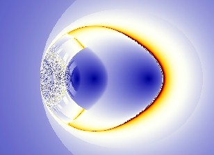 Im großen Schädel links entstehen schnell sehr große negative Zahlen, die durch die Verkopplung entweder etwas schneller (blau) oder etwas langsamer (rot) divergieren. Etwa bei Zx=1/A wird das Cx=-1 kompensiert oder verdoppelt, was bereits klare Unterschiede im Divergenzverhalten bringt, die sich hier als Schädelmuster darstellen. Das additive Cx der Größe Minus Eins ist hier die entscheidende symmetriebrechende Einheit. Setzt man es ganz Null, werden beide 'Hirne' leer und strukturlos. Mehr