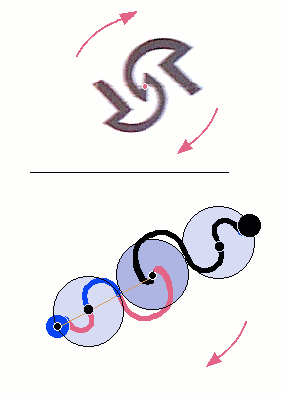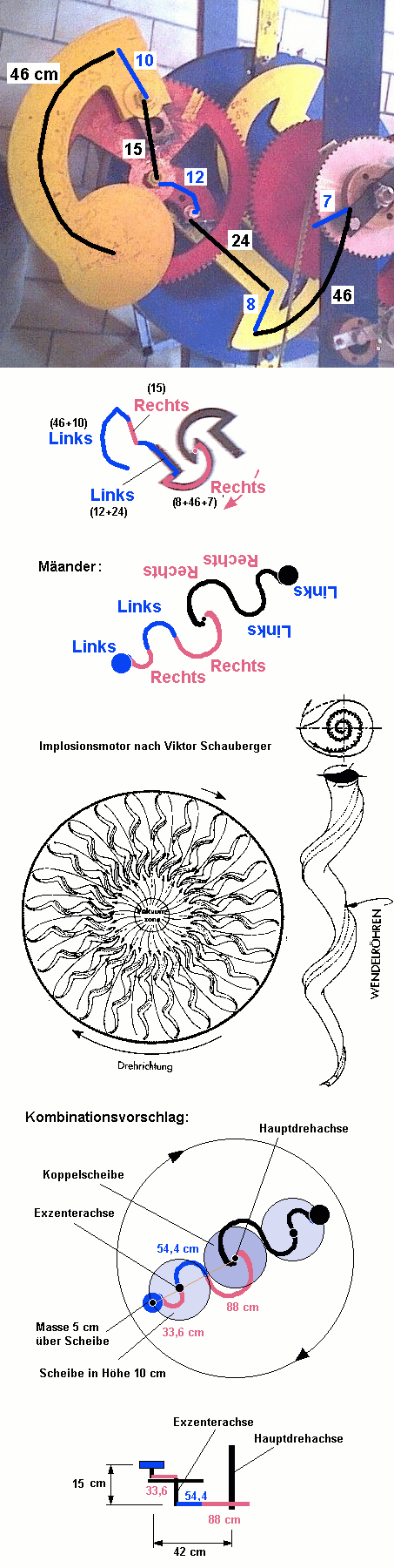 Ich fasse nochmal zusammen: Es ist ein schwingendes Feder-Masse-System, das in einer Richtung der Gravitation als antreibender Kraft unterworfen ist (Federkonstante(dz)), und in der Waagerechten in Richtung nach außen der Rotations-Fliehkraft (Federkonstante(dR)). Diese beiden Anteile schwingen aufgrund der resonanten Anordnung so, daß sie gleichzeitig das Material belasten und dann wieder gleichzeitig entlasten. Die Folge (Bernoulli!) ist invers dazu eine longitudinale Schwingung in Bahngeschwindigkeitsrichtung, wobei auch hier das Material als Masse-Feder-System jeweils dagegenarbeitet und eine passende Federkonstante(ds) braucht. Soweit sogut. Eine irgendwie in 3D-schwingende Feder, die man um eine Drehachse rotieren läßt, macht noch lange nicht gezwungenermaßen Overunity. Warum klappt es hier ? Alle drei Einzelschwingungen ergeben zusammen eine kleine asymmetrische Raumkurve von Torkadoform, und diese wird im Laufe eines Kreises mehrfach wiederholt. Das Aufsteigen gegen die Schwerkraft und das Heranziehen gegen die Fliehkraft erfolgt durch die elastischen Rückstellkräfte des gequälten Materials zur gleichen Zeit, und zwar schneller als die vorherige umgekehrte Bewegung. Es gibt während dieser kurzen Rückschwingbewegung einen kurzen starken Kraftstoß vorwärts, der bis zur Drehachse vordringt und sie in Drehrichtung beschleunigt. Dafür sorgt die Form der 'Spiralgalaxie'. In der zweiten, längeren Schwingphase ist der bremsende Kraftstoß pro Zeiteinheit schwächer, denn die gleiche Energie ist länger unterwegs in Richtung Drehachse. In den Winkeln der Spiralgalaxie wird seine Energie als Wärme und Widerstand verbraucht.