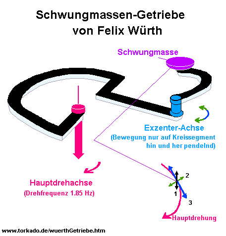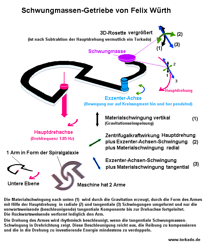 Komponente bis zur Drehachse fortgeleitet. Die Drehung des Armes wird rhythmisch beschleunigt, wenn die tangentiale Schwungmassen-Schwingung in Drehrichtung zeigt. Diese Beschleunigung reicht aus, die Reibung zu kompensieren und die in die Drehung zu investierende Energie mindestens zu verdoppeln.