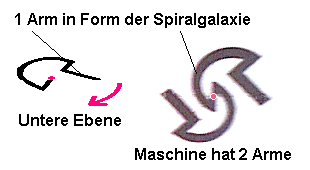 Die Spiralgalaxie wirkt wie eine Diode. Man sehe sich das Bild an. Der kurze Vorwärtsschub reißt sofort an der Drehachse beschleunigend, aber der langsame Rückwärtsschub knickt nur die äußeren Armbiegungen zusammen, und fast nichts kommt an der Drehachse an. Ein nicht zu vernachlässigender Trick an dem Ganzen ist aber, die kleine Torkadoschwingung so aufzubauen wie beschrieben. Dazu ist es nötig, daß die Gesamt-Armlänge genau L*phi (für das schwingende Material) groß ist. Falls die Armlänge auf L allein eingestellt ist oder in der Nähe von L, dann schwingt das System entweder rückwärts in der kurzen Phase, was die Bremswirkung erhöht, oder es schwingt nur in dR und dz, das wären einfache steile Spiralen auf einem Torus, wie der Draht auf einer Ringspule. Dort hat man auch nie Overunity, wohl aber in Spulen, die in Schleifen gewickelt sind und die naturrichtige Ausrichtung haben: